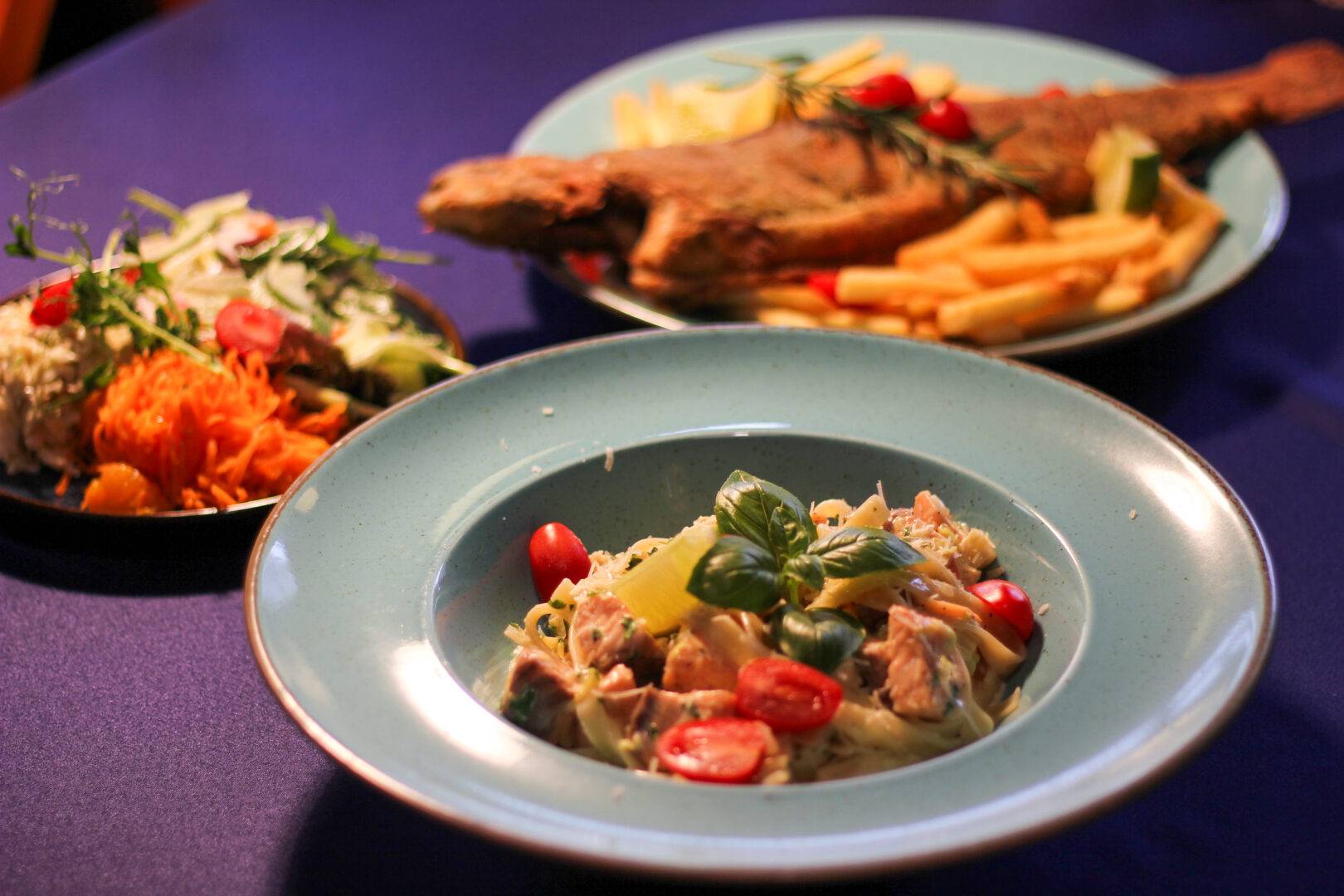 Kiełbaski, wędlin, ser, jajecznica, serek homogenizowany, dżemy, Nutella, ciasto, pieczywo, sałatka, warzywa (pomidor, ogórek, papryka), masło, napoje zimne i gorące bez limitu.